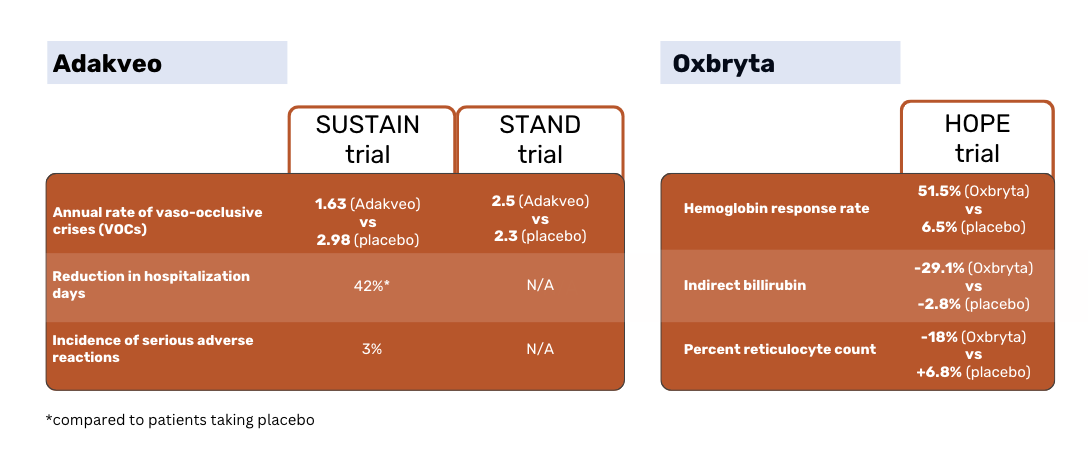 The efficacy of Adakveo (crizanlizumab) and Oxbryta (voxelotor) has been studied in clinical trials.