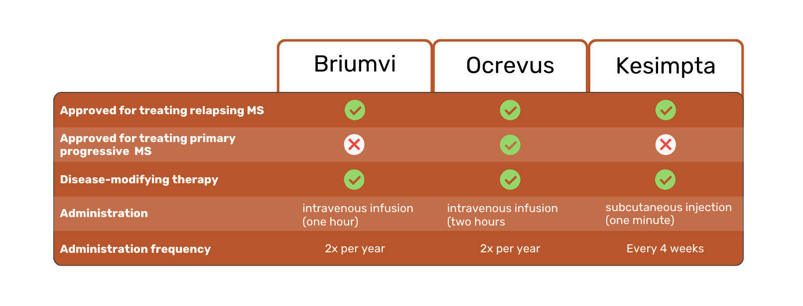 Another difference between the three MS treatments is the frequency and duration of administration. Briumvi requires one-hour infusions twice a year. In comparison, Ocrevus requires two 2-hour infusions per year. Kesimpta injections are required every four weeks.