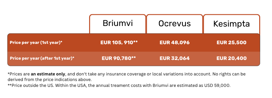 However, the situation differs for patients in the EU and other regions outside the USA. While Brumvi is approved in the EU, it is not yet commercially available there, resulting in higher sourcing costs. As soon as EU pricing for Briumvi is set and the treatment becomes available locally, the price for non-US patients is likely to also go down. We’ve seen a similar trend with Kesimpta and Ocrevus, which have been on the EU market for several years.
