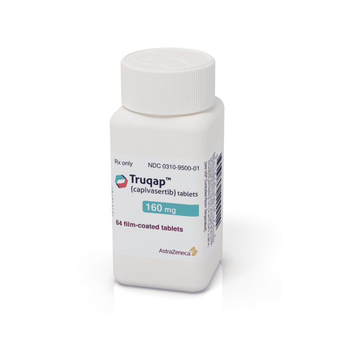 Truqap (capivasertib) is prescribed in combination with fulvestrant to treat adults diagnosed with HR-positive, HER2-negative locally advanced or metastatic breast cancer exhibiting specific genetic alterations in PIK3CA/AKT1/PTEN 1. Capivasertib's active ingredient targets the AKT protein, crucial for cancer cell growth. By inhibiting AKT's activity, capivasertib aims to slow down tumor growth 2.