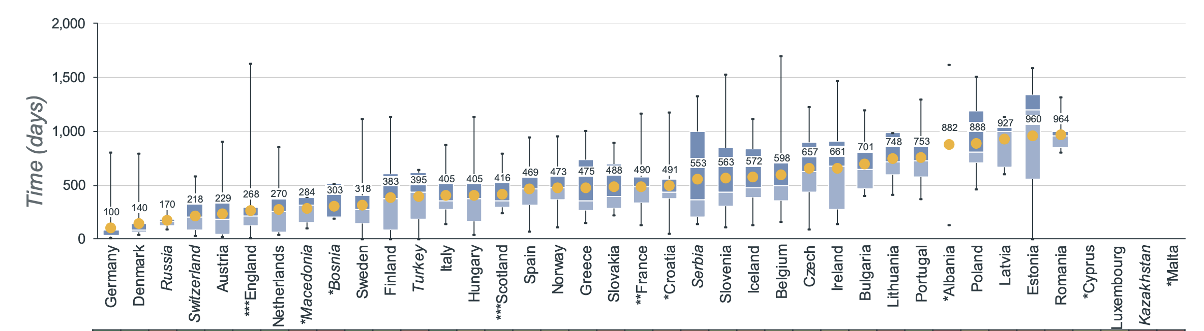 The average time needed from the moment a medicine gets EMA approval to the moment it's available on the market varies a lot per country. The European average for oncology treatments in 2022 was 511 days between EMA marketing authorization and date of wide availability. In Belgium, the average time to availability is 598 days [4].