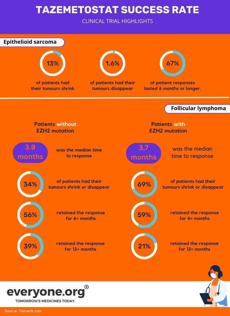 Currently, Tazverik (tazemetostat) is FDA-approved for the treatment of epithelioid sarcoma and follicular lymphoma (with or without an EZH2 mutation) 2. Tazverik's approval was accelerated. Meaning that it was based on the clinical trial data available at the time. However, further clinical trials may be needed to verify its efficacy and to support its approval.