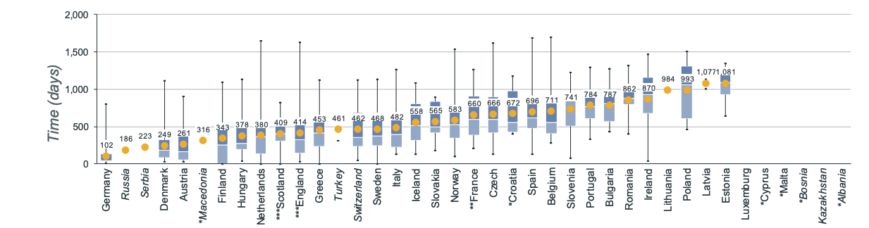 New medicines take on average 511 days after EMA approval to become available across the EU. This timeline is dramatically different per country. For orphan medicines such as vamorolone, It ranges from 102 days in Germany to 1,081 days in Estonia 5.